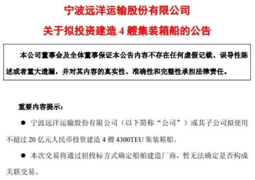 宁波远洋发布公告,公司或其子公司拟使用不超过20亿元人民币投资建造4艘4300TEU集装箱船。
