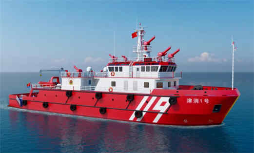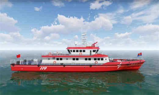 1200t消防船为全焊接式单甲板单体钢质船舶,总长54.00米,型宽13.20米,型深6.00米,设计吃水3.90米;采用两台柴油机驱动两套可调全回转舵桨装置,配备一台首侧推。该船建成后,主要用于港口及近海航区消防作业,可承担对港口码头等临岸设施及海上失火船舶的灭火救助工作,也可对沿海城市岸边建筑物的失火进行扑灭救助及对陆上进行对岸供水。该型船还配有1艘救援艇和1艘救助艇,同时配备相关救助设备,包括抛投式救生圈及气动抛投器、智能救生圈和空水两用救援无人机、救生攀爬网、担架、氧气袋、急救箱等,可有效对人员进行人命救助。