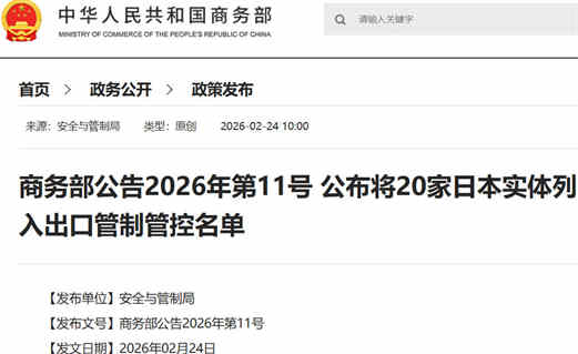 商务部公告2026年第11号 公布将20家日本实体列入出口管制管控名单