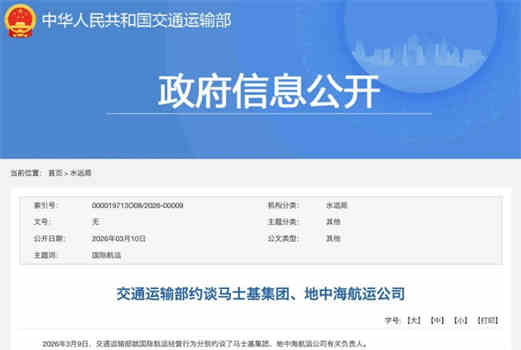 2026年3月9日,交通运输部就国际航运经营行为分别约谈了马士基集团、地中海航运公司有关负责人。
