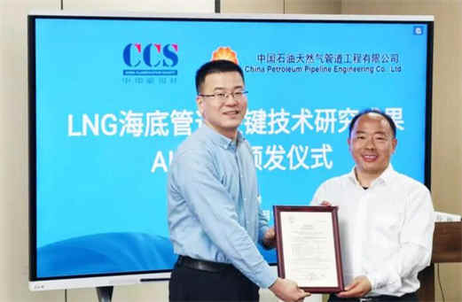 近日,中国船级社(CCS)在新型海底管道服务能力建设方面取得新成果,CCS海洋工程技术中心为中国石油天然气管道工程有限公司颁发国内首张LNG管道AIP证书,服务保障我国海工行业在LNG安全高效输送技术领域开辟新路径。
