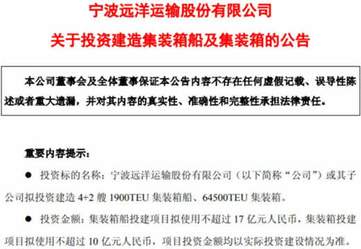 与此同时,为配合运力规划及部分老旧集装箱资产的更新迭代需求,宁波远洋或其子公司拟使用不超过10亿元人民币投资建造64500TEU集装箱。