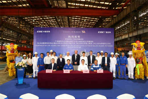 该船型为广船国际自主研发,总长250米、型宽44米,载重吨11.1万吨,采用双燃料推进,满足IMO TIER III排放标准,EEDI能效指数达Phase3,兼具高效、节能、环保优势,系列船计划建造8艘。
